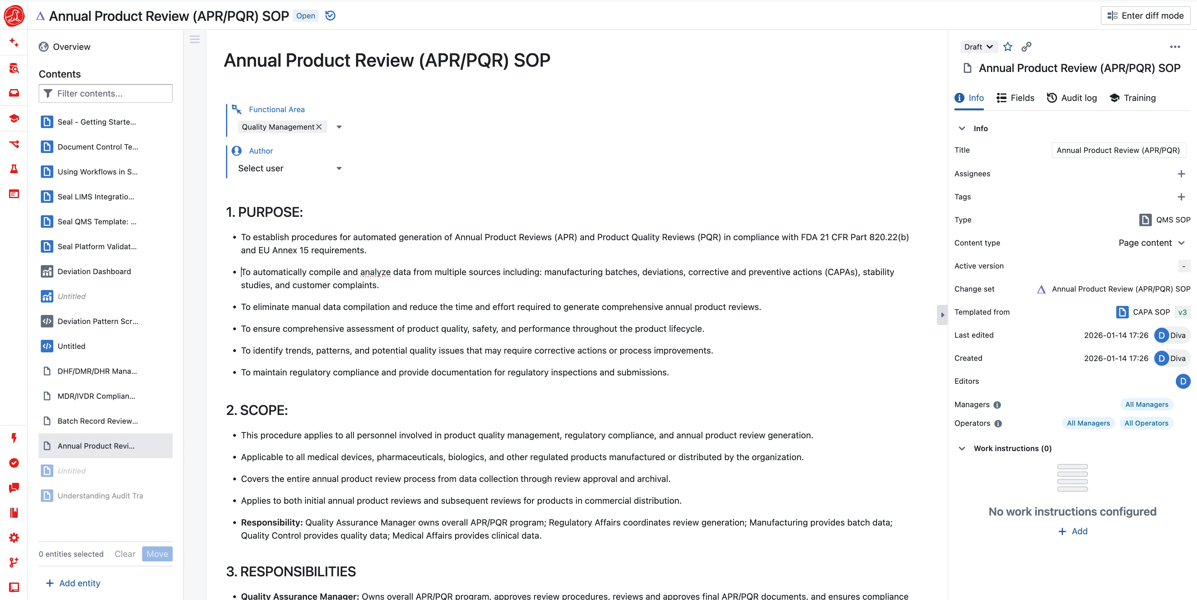 Quality Management Reviews pull deviation metrics, CAPA status, training compliance, supplier scores—everything leadership needs for the monthly quality meeting. The template knows the format. Data flows in. AI summarizes trends and flags concerns. Review, approve, distribute.